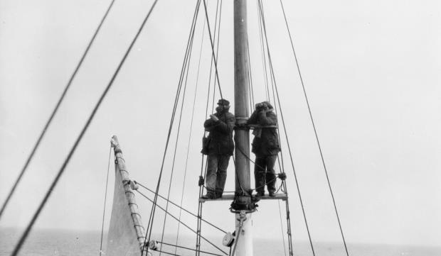Sailors on the John R. Manta, Hatteras grounds, 1925. The first photograph shows two lookouts in the main mast. Capt. Mandly kept two lookouts in the main mast and one in the forward mast throughout the day. They stayed aloft in 2-hour shifts, with even the mates taking a turn.