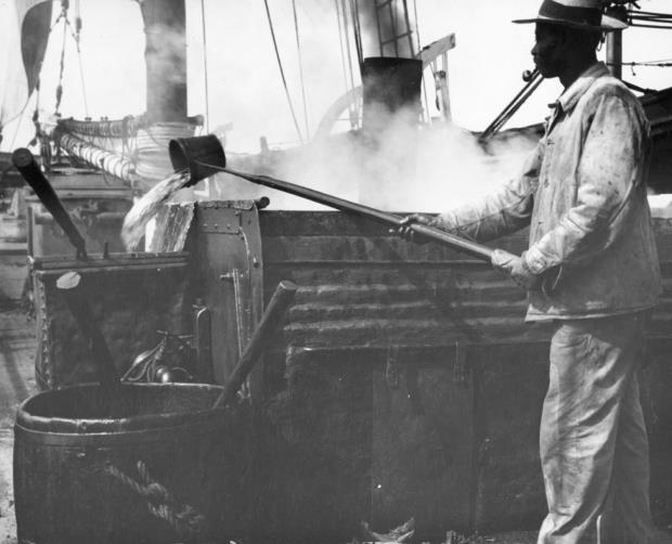 The third photograph depicts one of the hands using a copper bailer to ladle the hot oil, fresh from the fire in the try-works, into a cooler. The cooler was a tank, also copper, lashed to the try-works. Once the oil was no longer scalding hot, the sailor opened a valve in the cooler’s bottom and let the oil flow through a pipe into storage tanks below deck.