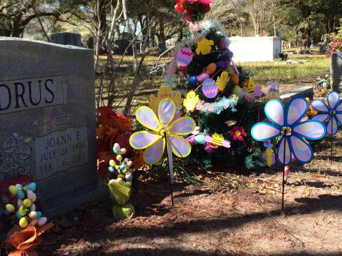 This past Christmas I found several Christmas trees and wreaths on grave plots at Oceanview—and I love this Easter egg tree that was still up a few days ago. To me it’s a beautiful, beautiful thing.