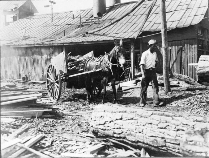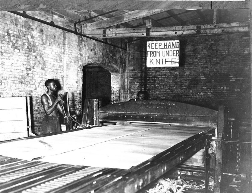 According to newspaper reports, the Weitz plant’s workers were largely using the veneer to manufacture wooden boxes when this photograph was taken in the late 1930s.