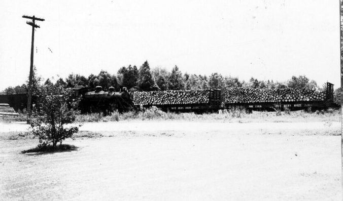 Finally, we see a train load of logs rolling down the branch of the Atlantic Coast Line Railroad between Plymouth and Williamston, N.C., ca. 1938.