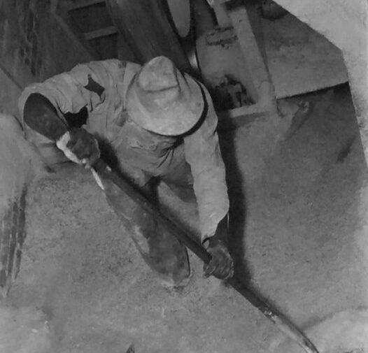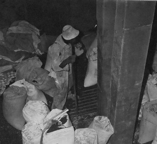 In this photograph, we see the next step in the process of making soybean oil and meal: one of the company’s workers is dumping soybeans onto a conveyor belt that will carry them up a chute to a hopper.