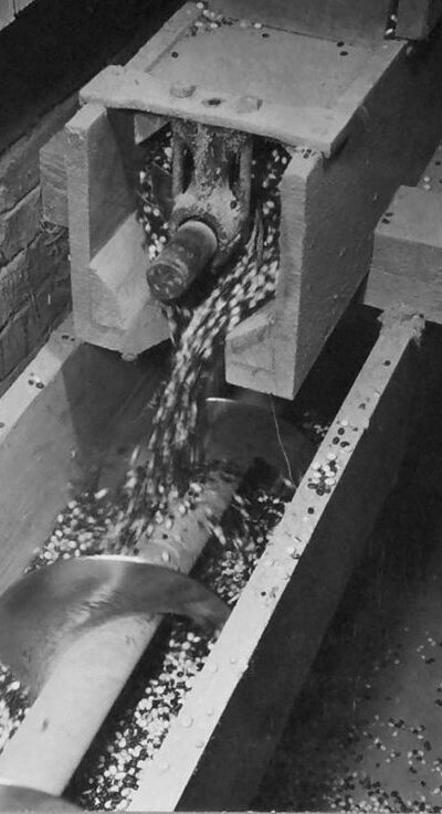 Here we have an up-close view of the soybeans passing through the trough, sliding down toward the crushing machines.