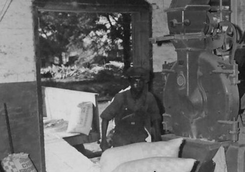 Here we see one of the Southern Cotton Oil Co.’s workers hauling bags of soybeans into the plant’s crushing room.