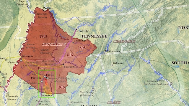 I am not sure if Allen Sidney was referring to Lauderdale County, Tennessee, or Lauderdale County, Alabama. Both were carved out of the Chickasaw lands ceded to white settlers in the Chickasaw Treaty of 1818, but only Lauderdale County, Alabama, located just south of the Tennessee border, was on the path of the Tennessee River. Evidently, either Sidney misspoke or the Detroit News-Tribune misquoted him. Lauderdale County, Tenn, is located on a river however– the Mississippi– and in the early 1800s, Tennessee law did in some places and some times allow settlers to acquire former Native American lands simply by occupying them and showing that they had improved them over a period of years. Relatively few white settlers acquired land in either Lauderdale County, Tennessee, or Lauderdale County, Alabama, however, until after the signing of the Chickasaw Treaty of 1818. After that time, a land rush of white settlers– including Simeon Perry, Jr.,– moved into the region that had historically been a homeland of the Chickasaw people. Map source: Chickasaw TV Video Network
