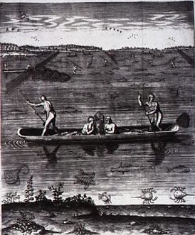 From The Waterman’s Song: “Native boatmanship gained a singular reputation among the European colonists, who frequently found themselves at a loss on coastal salt marshes, rivers, and sounds. The colonists rather regretfully came to appreciate Indian small-craft skills first during the Tuscarora War of 1711-1713, a monumental and very bloody conflict that ultimately forced all coastal Indians into political subjugation or exile. In 1713, when the Matchapunga remained one of only two tribes that had not fallen to the English, the colony’s presiding governor cautioned that his Indian enemies would not be easy to defeat. ‘They have got … boats and canoes, being expert men,’ Thomas Pollock warned, and they would voyage into `lakes, quagmires, and cane swamps … where it is almost impossible for white men to follow them.” This scene is a Theodor De Bay engraving of John White’s drawing “Their manner of fishynge in Virginia,” ca. 1590. During the Roanoke voyages of 1584-1590, White drew the composite portrait of Algonquian fishing methods in the vicinity of the Outer Banks on which this later engraving is based.Courtesy, North Carolina Collection, UNC-Chapel Hill.
