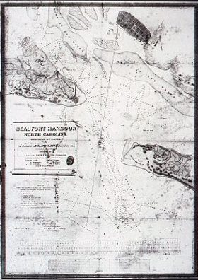 From The Waterman’s Song: “Slave watermen brought the Civil War to Beaufort, N.C., on the night of April 22, 1862. The old seaport’s citizens were sleeping peacefully, confidant that the guns of Fort Macon stood between them and a Union assault for at least several more days. Unbeknownst to them, local slave fishermen stood ready to launch rowboats carrying Federal troops from a secluded wharf 3 miles west. George Allen, a corporal in the 4th Rhode Island Volunteers, later recalled that the fishermen were `thoroughly conversant with these waters, and were faithful guides.’ Hidden from the fort Macon lookouts by darkness, they snaked the boats through the labyrinthine shoals of Bogue Sound and navigated a narrow channel across the mouth of the Newport River. Then, without a word spoken…, they slipped the craft beneath Fort Macon’s 10-inch cannons at pistol-shot range…. then let the incoming tide drift the Union troops into the harbor…. At sunrise…, Beaufort citizens awoke to find bluecoats pickets patrolling their sand-and-oyster-shell streets.” (James Glynn, “Beaufort Harbor,” 1839. Courtesy, N.C. Collection, UNC-Chapel Hill.