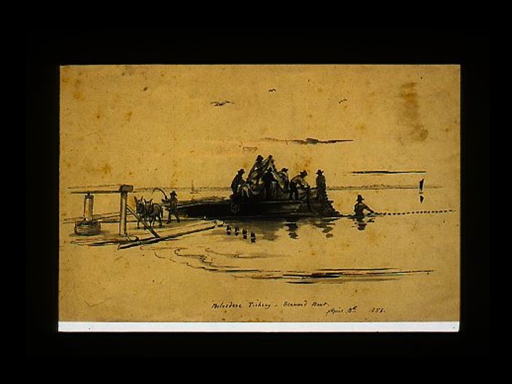 “Landward Boat,” Montpelier Fishery, 1856, by David Hunter Strother. Courtesy, West Virginia and Regional History Collection, West Virginia University (WVU). One of the largest commercial fisheries in North America was located on the North Carolina coast– the seine fishery for herring, shad, and rockfish– and it was wholly reliant on thousands of African American laborers, both many whom were free and many whom were enslaved. From The Waterman’s Song: “In 1840 William Valentine visited a seine fishery by the Albemarle Sound. Great crowds gathered to watch African American fishermen catching hundreds of thousands of shad, rockfish, and herring. The black boatmen wielded seines massive enough to span whole inlets and river mouths. They fished around the clock seven days a week, working at night in the flickering glow of torches, bonfires, and lanterns.”