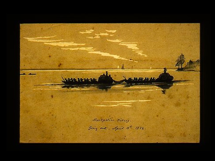“Going Out,” Montpelier Fishery, 1856, by David Hunter Strother. Courtesy, West Virginia and Regional History Collection, WVU. From The Waterman’s Song: “The fishermen combed the water with gigantic seines that averaged approximately 2,500 yards in length and ranged from 12 to 24 feet in depth…. In crews of 8 to 20, they laid out the seines in two long rowing boats…usually 40 to 60 feet long….The fishermen first packed the seine on the stern platforms of their two boats. They rowed together approximately a mile directly off the landing, and then the helmsmen steered the boats in opposite directions, parallel to the shore, as the two crews slowly laid out the seine between them.”