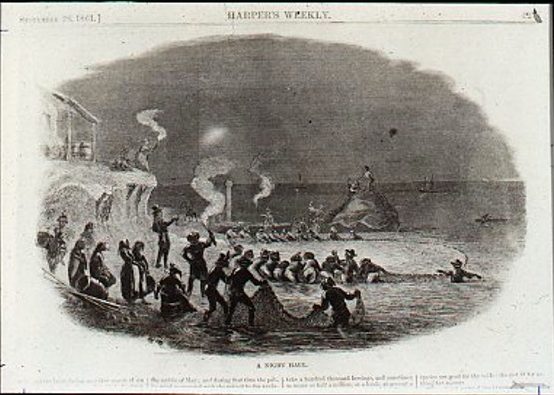 A Night Haul,” by David Hunter Strother, from Harper’s Weekly, September 28, 1861. Courtesy, State Archives of North Carolina. From The Waterman’s Song: “The size of their catches confounds the imagination. The black fishermen often caught 100,000 herring in a single haul and occasionally more than a million. As a general rule, fishery owners estimated that their workers caught one-tenth to one-twentieth the number of shad as herring…. Fishing crews caught far fewer rockfish, but at rate moments rockfish runs sometimes rivaled the harvest of the smaller fish…. In 1858 slave fishermen at W. R. Capehart’s Black Walnut Point fishery in Bertie County purportedly caught 30,000 pounds [of rockfish] in one haul.”