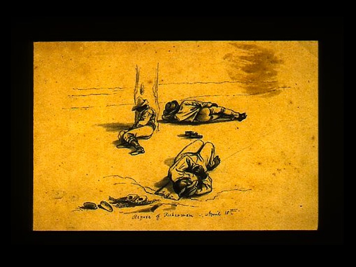 “Repose of Fishermen,” 1856, by David Hunter Strother. Courtesy, West Virginia and Regional History Collection, WVU. From The Waterman’s Song: “No matter how enlivening, the fishery was still a Herculean test of endurance and perseverance. One observer described the ardor and stamina required of the laborers as `equal to that of a brisk military campaign in the face of the enemy.’ The fish ran so bountifully during the six- to eight-week peak season that the fishermen worked the seines every day of the week, all day and all night. …. Edmund Ruffin … visited several seine fisheries in the hectic midst of such fish runs…. He observed that `the hands, like sailors at sea, work and rest … not by day and by night, but by shorter `watches.” William Valentine likewise marveled at `what regularity and system they manage so as to allow time for all to rest,’ yet he acknowledged, too, that the fishermen sometimes `have almost to banish sleep….’ March was the most trying month. Often the coldest days of Albemarle Sound winters occurred in March. Those days left seines and lines frozen stiff and boatmen hacking their way through ice.”
