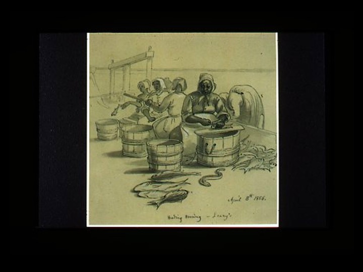 “Heading Herring,” 1856, by David Hunter Strother. Courtesy, West Virginia and Regional History Collection, WVU. From The Waterman’s Song: “Because they needed to complete their labors between hauls, the cutters, washers, and salters– mostly African American women and children– maintained a pace that rivaled that of the haul seiners. When the fishermen loaded their net for the next haul, the women and children had already begun their work on the beach…. At the Montpelier fishery [shown here], top cutters Elvy Speight, Anna Holland, and Edy Howell headed tens of thousands of herring a day.”