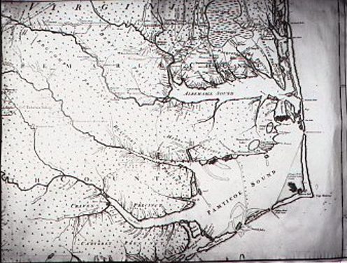 The Lower Banks, Outer Banks, and the major sounds of North Carolina. Inset from a map by Edward Mosely, 1733. Courtesy, North Carolina Collection, UNC-Chapel Hill