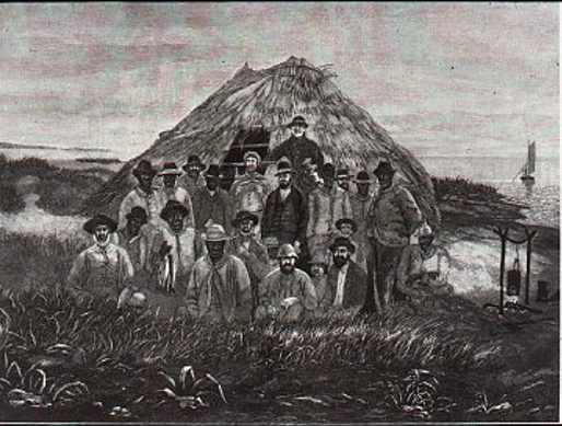 Engraving of mullet fishermen at their camp, Shackleford Banks, circa 1880. From George Brown Goode, ed., The Fisheries and Fishery Industries of the United States, 5 secs. (Washington, DC: Commission of Fish and Fisheries, 1884-1887), sec. 5, vol. 2