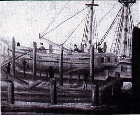 African American ship caulkers such as the ones seen in this oil painting were among the many black ship’s shipbuilders, iron workers, sail makers, cord swains, and other tradesmen who worked in shipyards and boatyards on the North Carolina coast. From The Waterman’s Song: “In 1782 …, at the `most commodious, and … best shipyard in the providence [sic],” on Indiantown Creek, in Currituck County, N.C., Thomas MacKnight was said to own `the most valuable collection of Negroes in that country– They were able to build a ship within themselves with no other assistance than a Master Builder.” Courtesy the Mariners Museum, Newport News, Va.