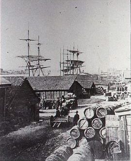 Barrels of turpentine at the docks in Wilmington ca. 1880. Courtesy, State Archives of North Carolina