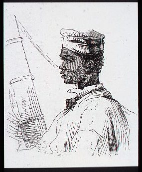 Ned, a sailor, drawn by David Hunter Strother during a visit to North Carolina. Harper’s New Monthly Magazine, March 1857. Courtesy, the Mariners’ Museum, Newport News, Va. From The Waterman’s Song: “On such waterfronts, [Moses] Grandy also met black mariners who hailed from every port on the eastern seaboard, as well as from the British, French, Spanish, Dutch, and Danish colonies in the Caribbean. Blacks composed the large majority of deckhands on the local vessels that traded with the West Indies, and a white lady in Washington [N.C.] long recalled those `large strong West Indies Negroes’ with their `bright bandanas … and large golden rings that hung from their ears.’ By working alongside such maritime laborers, slave watermen like Grandy helped local slave communities overcome their masters’ attempts to keep them isolated from one another and uninformed about antislavery movements stretching from Boston to Port-au-Prince.”